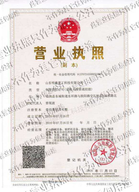 | 山東明鑫重工科技有限公司為是集科研開(kāi)發(fā),設(shè)計(jì)制造、銷售、安裝、調(diào)試為一體的技術(shù)制造企業(yè)。公司位于美麗的****風(fēng)箏都-濰坊市(國(guó)家AAAA級(jí)森林公園-沂山景區(qū)駐地)臨朐東城工業(yè)園。本公司產(chǎn)品種類有:破碎機(jī)設(shè)備,(電磁、永磁)除鐵器設(shè)備,磁選機(jī)設(shè)備,篩分設(shè)備,輸送設(shè)備,給料機(jī)設(shè)備,水泥自動(dòng)化控制設(shè)備、除塵設(shè)備,儀器儀表等產(chǎn)品。其產(chǎn)品有五十多個(gè)系列,四百多種規(guī)格,并可根據(jù)客戶需求設(shè)計(jì)生產(chǎn)相應(yīng)的產(chǎn)品。其產(chǎn)品廣泛應(yīng)用于冶金、電力、煤炭、礦山、造紙、食品、化工建材、耐火材料、磚瓦、水泥、玻璃等行業(yè),產(chǎn)品暢銷國(guó)內(nèi)三十多個(gè)省市、自治區(qū)。 |